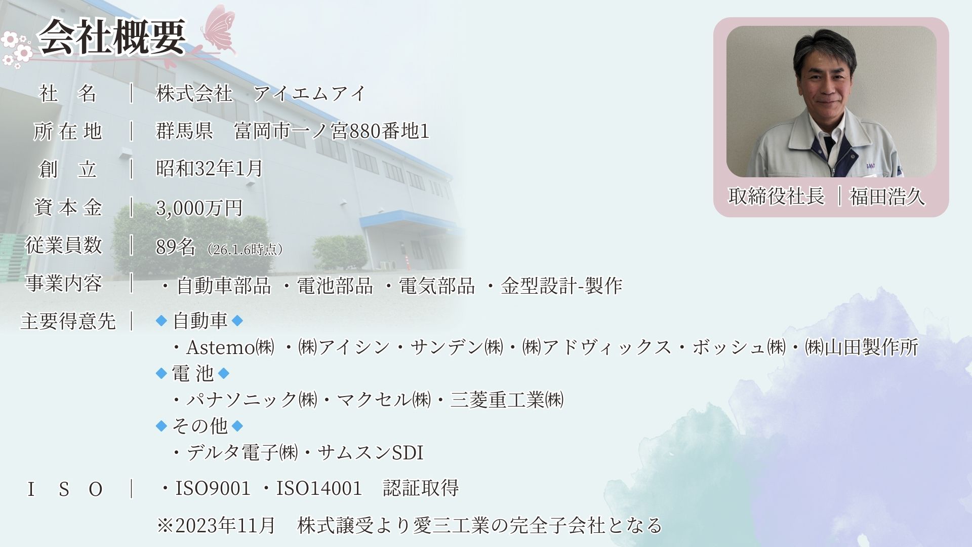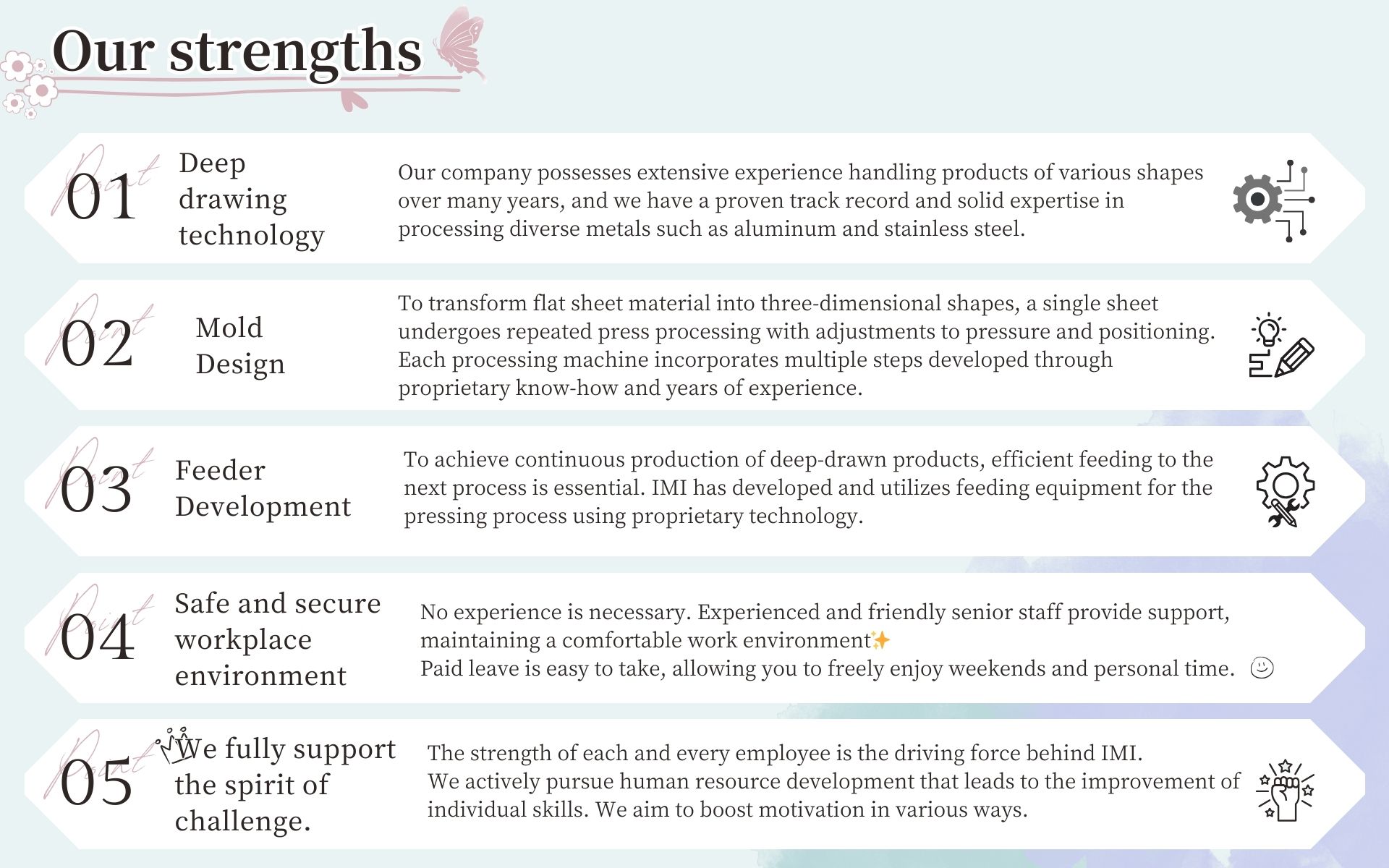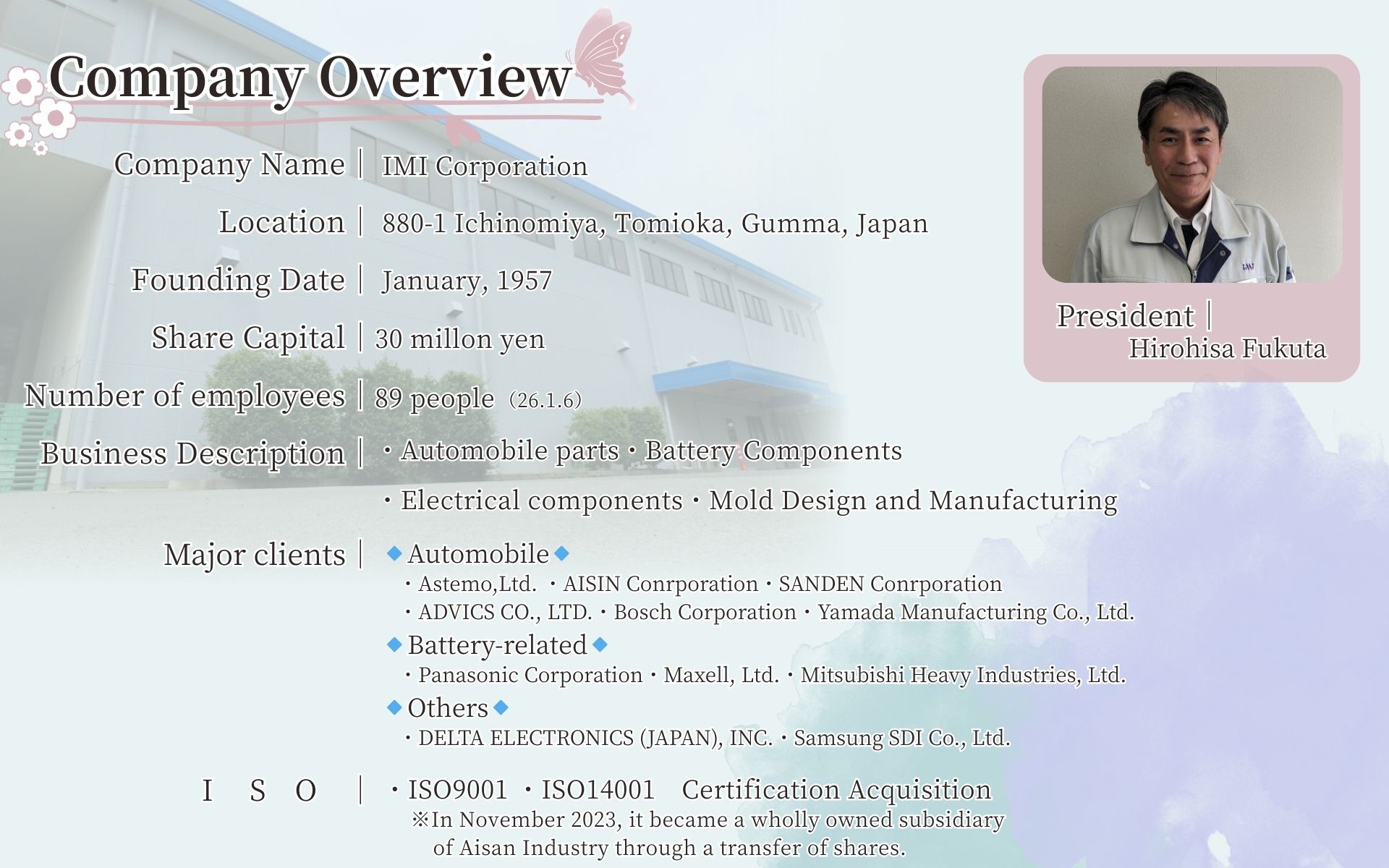 Since our establishment in 1957, we have been striving to improve our precision press work technology and associated die technologies. We have been making daily efforts to develop new technologies, aiming at the fusion and development of press die technologies and production technologies at a high level, with the utmost priority on customer satisfaction. Thanks to your support, we have been highly evaluated in a wide range of fields such as automotive parts and battery parts for the automated processing technology for precision stamped products that we have established. We would like to express our sincere gratitude to all of you for your support and encouragement. We will continue to improve our technology to provide satisfaction and peace of mind to our customers through our precision processing technology, and to realize new technology and quality assurance systems that will produce higher quality products, We will continue to develop together with our customers and contribute to the industrial society. We look forward to your continued support and encouragement.