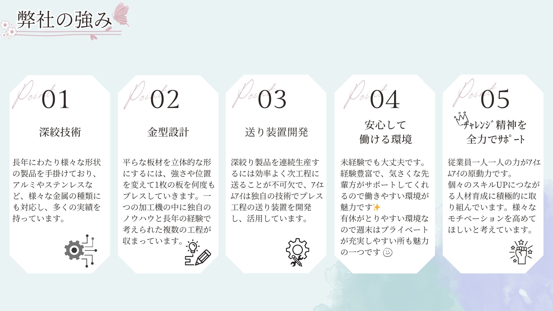 当社は、昭和32年の創業以来、精密プレス加工技術及びそれに伴う金型技術の向上に努めて参りました。さらにお客様に満足していただくことを第一として、プレス金型技術と生産技術との高い次元での融合・発展を目指し、日々新しい技術開発に努力しております。 お陰様で、これまで築き上げた精密プレス製品の自動加工技術に対して、自動車部品や電池部品等の幅広い分野で高い評価を頂いております。ひとえに皆様方のご支援ご鞭撻のたまものと心より感謝申し上げます。 精密加工技術を通じて、常にお客様に満足と安心感を提供できるよう、絶えず技術を磨き、より高品質な製品を生む新技術と品質保証システムを実現し、技術創造企業として邁進する所存です。21世紀に通用する企業を目指し、物づくりを愛するバイタリティにあふれたスタッフ一同、お客様とともに発展し、産業社会に貢献して参ります。 今後とも一層のお引き立て、ご鞭撻をお願い申し上げます。